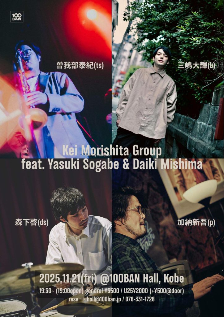 ■Players:森下啓(ds) 曽我部泰紀(ts) 加納新吾(p) 三嶋大輝(b)