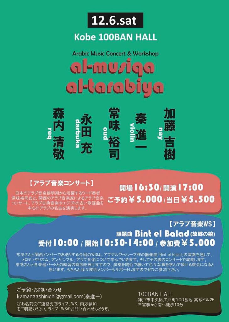 今回はアブデルワッハーブの器楽曲「bint el balad」に全体で取り組みながら、各楽器パートと常味さんとの練習時間を設けます。常味さんと演奏しながら、曲のこと、マカーム、イーカー、アンサンブル、アラブ音楽についてなど直接教わっていきましょう。我々関西のアラブ音楽家もサポートします。そして、WS後のライブのオープニングで演奏したいと思います。ぜひご参加ください。