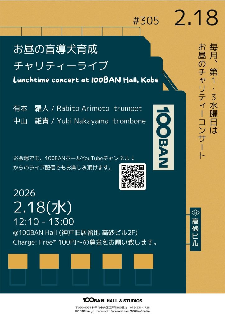 100BANホールのYouTubeチャンネル( https://www.youtube.com/channel/UCZcxw2xHV_7othIh6iUDpLg )でのライブ配信も実施しますので、遠方の方やご都合のつかない方は是非そちらをお楽しみ下さい。