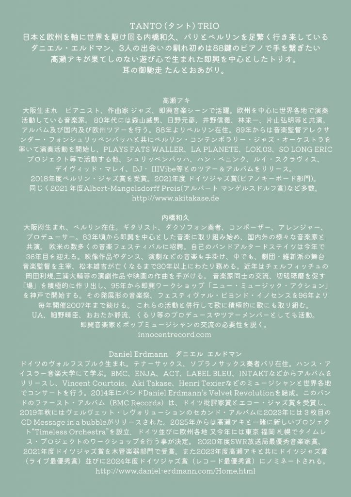 日本と欧州を軸に世界を駆け回る内橋和久、パリとベルリンを足繁く行き来していダニエル・エルドマン、3人の出会いの馴れ初めは88鍵のピアノで手を繋ぎたい高瀬アキが果てしのない遊び心で生まれた即興を中心としたトリオ。耳の御馳走 たんとおあがり。